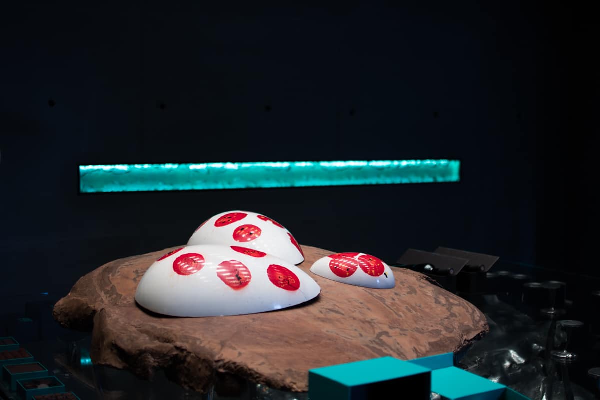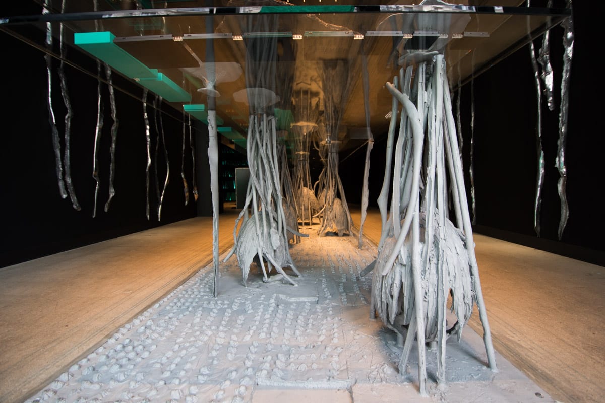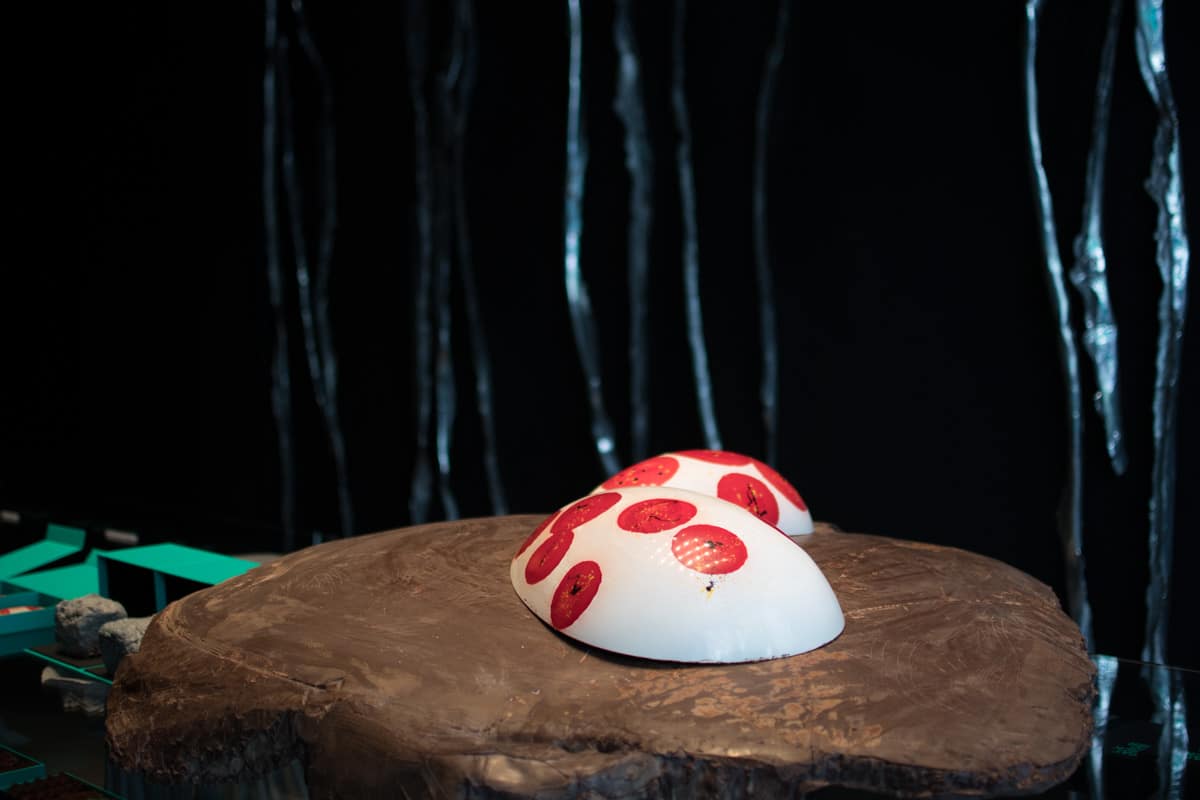 Patrick Roger was inspired for this sales outlet by a trip to Madagascar. Metal sheets run along the walls, and a strange structure supports the central glass shelf. Each “foot” seems composed of a giant fruit trapped in a tangle of vines. When you look closely at this structure, you discover the details, including hundreds of small monkeys emerging from the ground. The effect is seizing.
