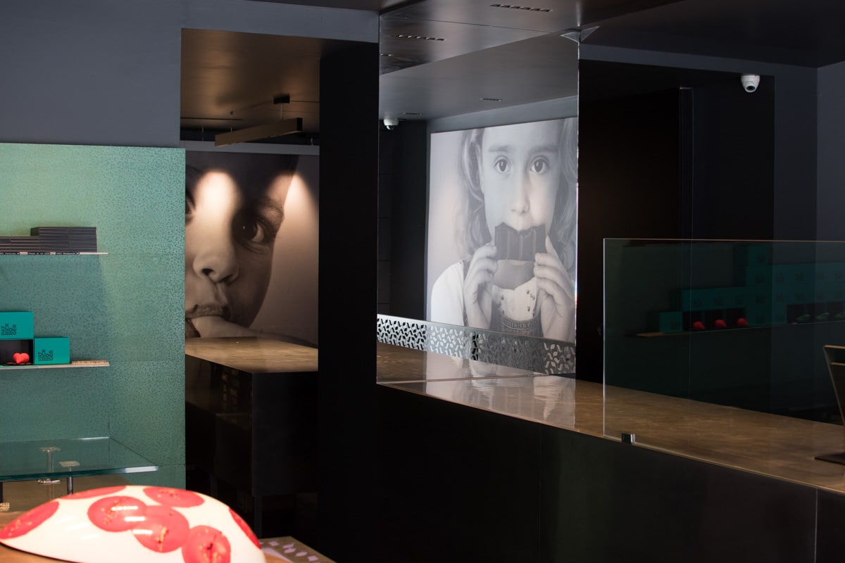 They all contrast strongly between black, omnipresent, and green, the chocolate maker’s favorite color. This strong contrast is adapted to this brand because of its high-end positioning. We can talk about an essential element of the marketing mix (P de “Place”), which participates in the brand’s recognition.