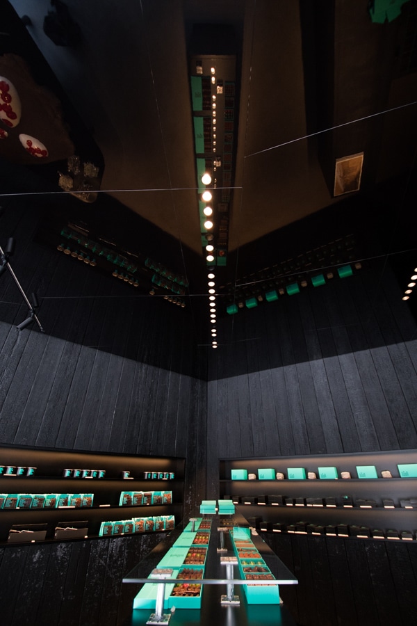 The Patrick Roger store on Rue de Sèvres was opened in 2021. Its style is a little different from the others. The treatment is still based on shades of black punctuated by green, but the rhythm is different. It does not have the horizontal rhythm printed elsewhere through the green packaging.