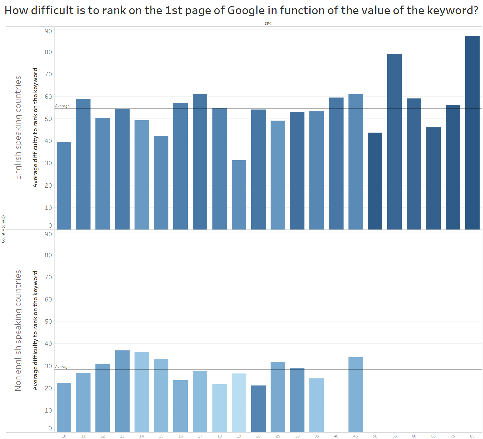 For the analyzed keywords monetized by Google for more than 10$, our research shows that the average difficulty as calculated by Ahrefs is 67% higher in English speaking countries compared to non-English speaking countries. The average difficulty of keywords over $10 is 54.43 in English-speaking countries and 28.31 in non-English-speaking countries.