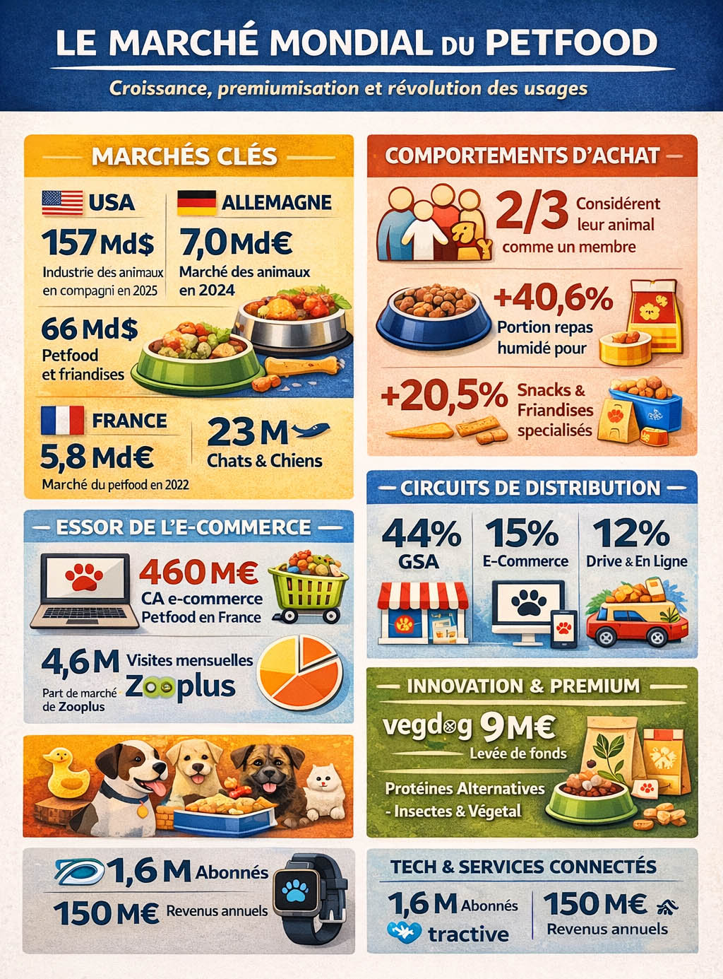 El mercado online está dominado por unos pocos grandes actores. Zooplus concentra casi la mitad de las ventas online de petfood en Francia, con unos ingresos estimados de 200 millones de euros y un tráfico mensual medio de 4,6 millones de visitas. Esta concentración ilustra la importancia de las economías de escala en el sector.