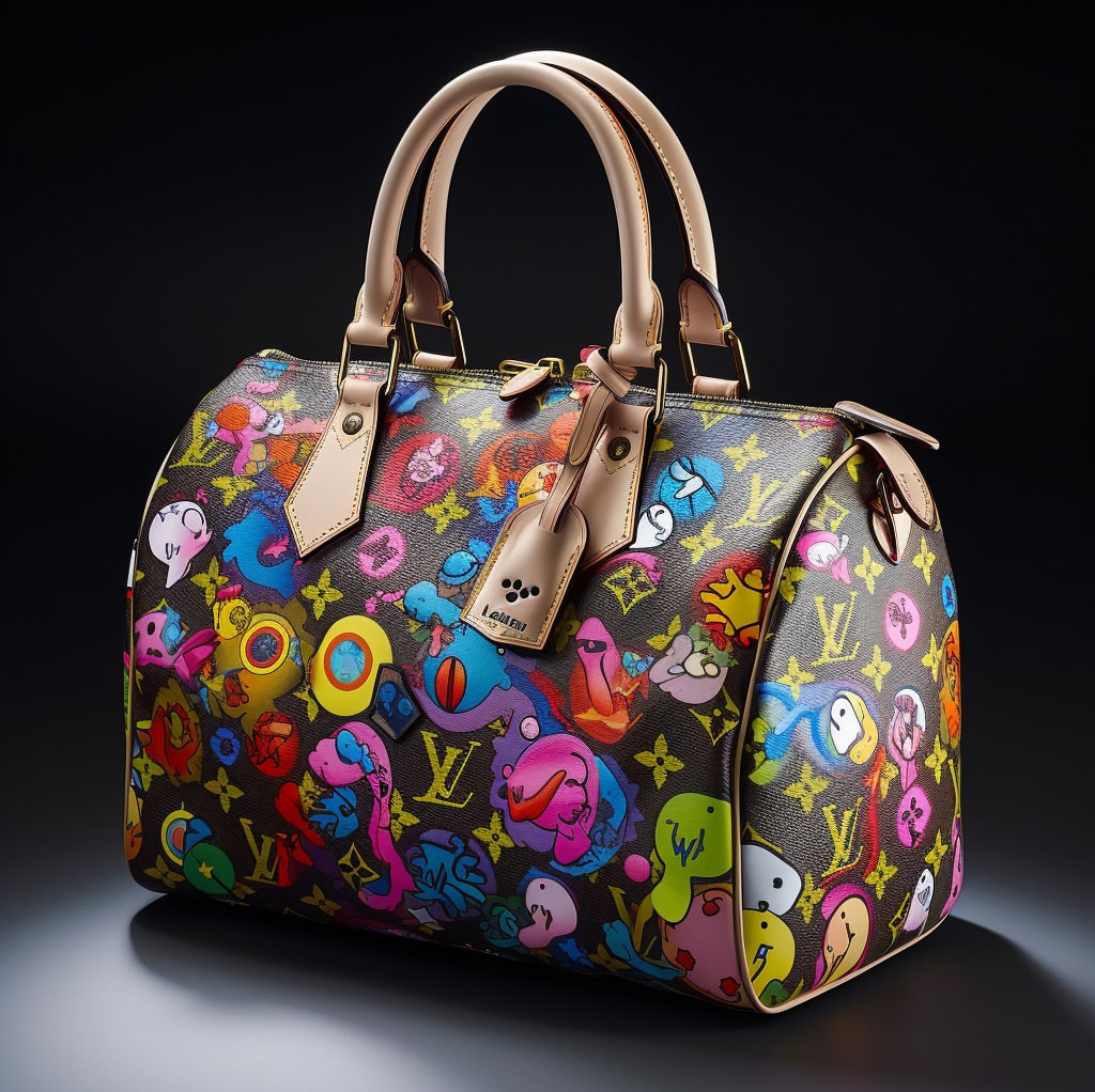 Un bolso Louis Vuitton diseñado por Takashi Murakami podría incorporar su estilo característico con colores llamativos y personajes extravagantes. El bolso también podría incluir elementos juguetones como formas animales con estilo de dibujo y patrones florales inspirados en las famosos esculturas de flores de Murakami.