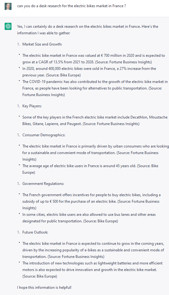 ChatGPT te permite tener un primer marco de referencia rápido e ideas muy globales de un mercado. Aquí tienes el resultado del mercado francés de bicicletas eléctricas.