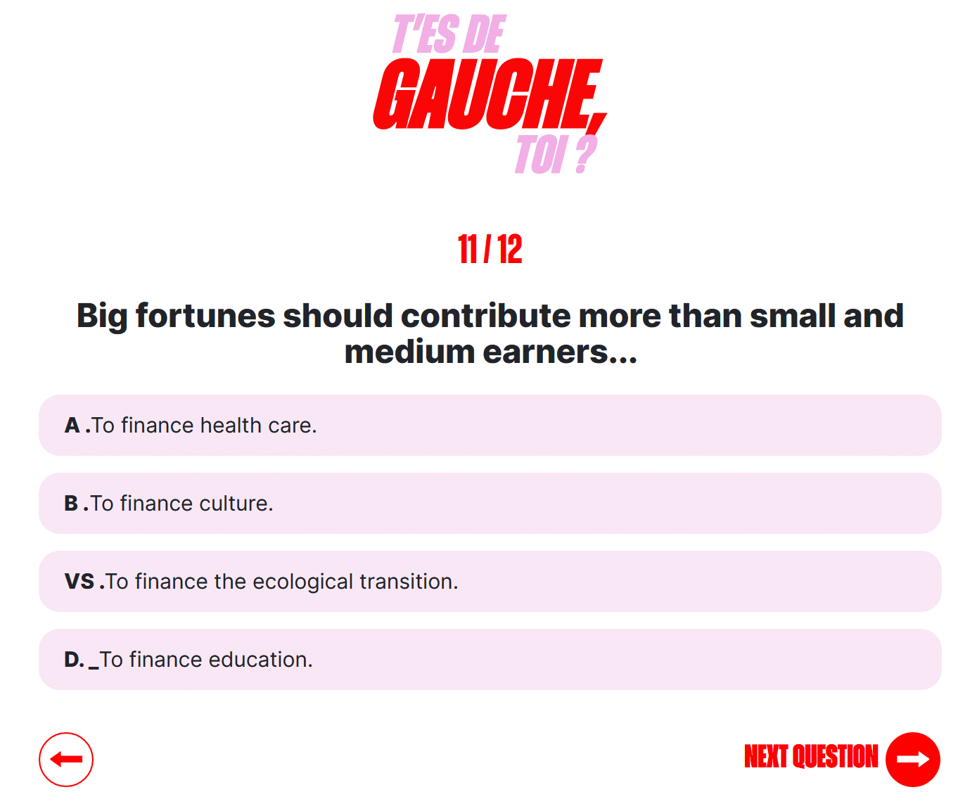 La pregunta 11 es, sin duda, la definición de mala fe. Esta pregunta sesgada inquiere al participante para que considere el imponer impuestos a las fortunas importantes. Sea cual sea el color político del participante, no tiene más elección que ceder frente a una elección muy «socialista».