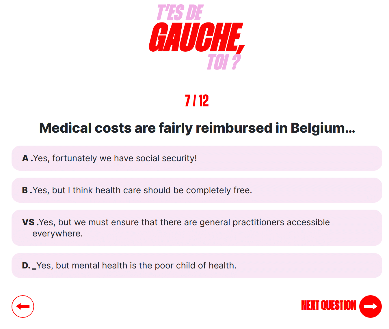 La pregunta 7 es bastante sintomática puesto que solo propone opciones de respuesta que empiezan con un «sí». También debería destacarse que las opciones de respuesta no están vinculadas con la pregunta y guían al participante a posicionarse en otros temas (salud mental, número de médicos). Si todavía queda alguna duda sobre la inutilidad de esta encuesta, es suficiente con analizar la segunda respuesta que, a través de un contrasentido, afirma que la sanidad se reembolsa lo suficiente, pero que debería ser gratuita. 🙃