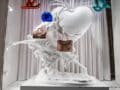 - Los globos en las 2 esquinas del escaparate: fíjate en cómo las iniciales de Jeff Koons se tratan del mismo modo que el logo de Louis Vuitton