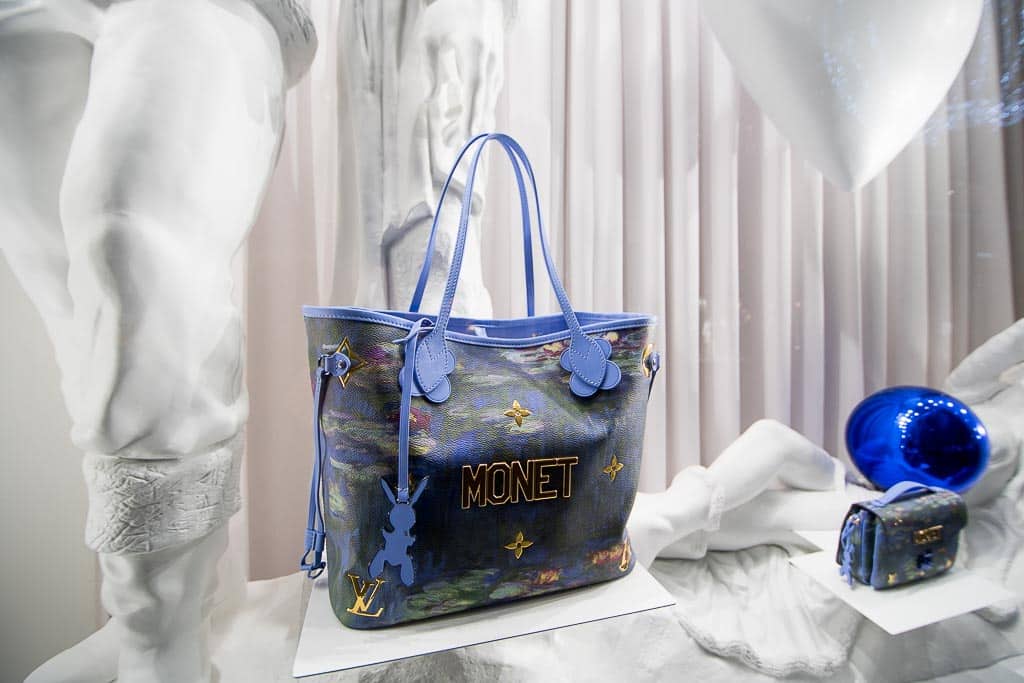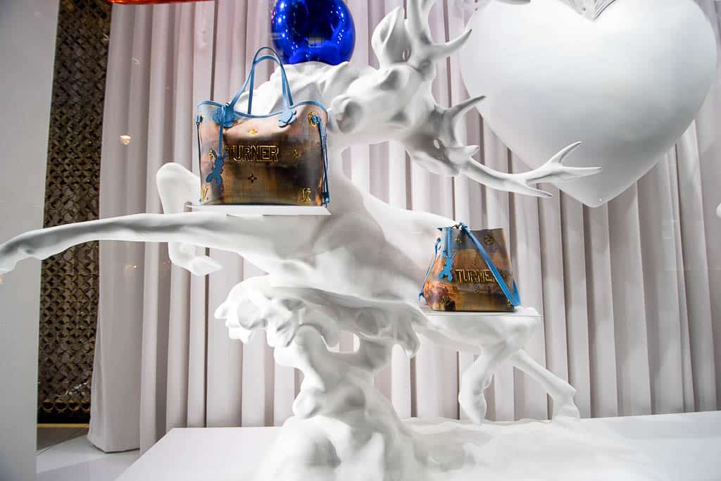 - Los globos en las 2 esquinas del escaparate: fíjate en cómo las iniciales de Jeff Koons se tratan del mismo modo que el logo de Louis Vuitton