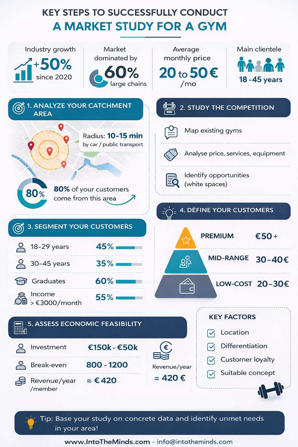 Un estudio de mercado para un gimnasio es la base de su proyecto empresarial. Permite verificar la viabilidad económica de su concepto, identificar oportunidades de diferenciación y desarrollar una estrategia de marketing adecuada para su ubicación. En este artículo, nuestro instituto explica paso a paso cómo llevar a cabo el análisis de mercado para crear una base financiera sólida. Y, como siempre: si necesita apoyo, no dude en contactarnos.
