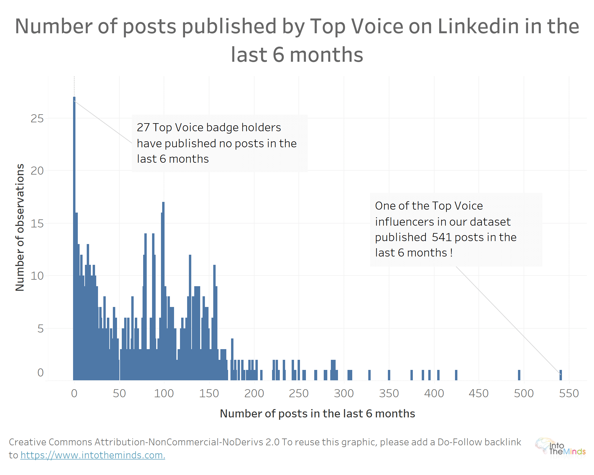 Si quieres convertirte en una Top Voice, quizá te preguntes si la frecuencia de tus publicaciones es importante. Esto es, por supuesto, algo que he estudiado. He analizado la frecuencia de publicación de los 1.000 influencers de mi conjunto de datos.
