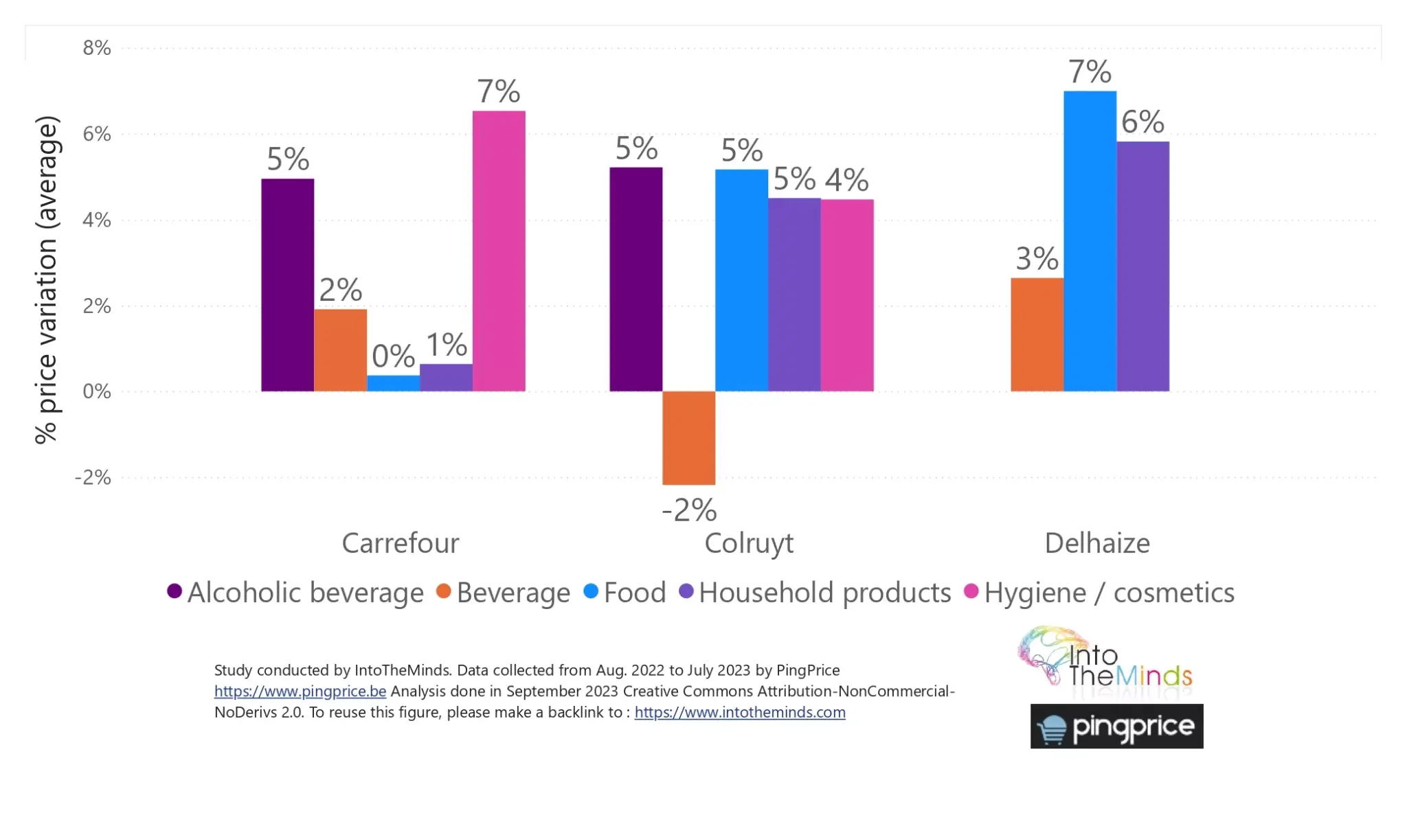 Sería interesante calcular el porcentaje de cambio medio por minorista para completa la visión anterior. Colruyt es el único minorista con una variación negativa (disminución de precios) a lo largo de los últimos 12 meses en la categoría de bebidas. De los 300 productos (100 productos para cada minorista), todas las demás categorías de productos han mostrado un aumento de hasta el 7% (el departamento de higiene/cosmética en Carrefour y de alimentación en Colruyt).