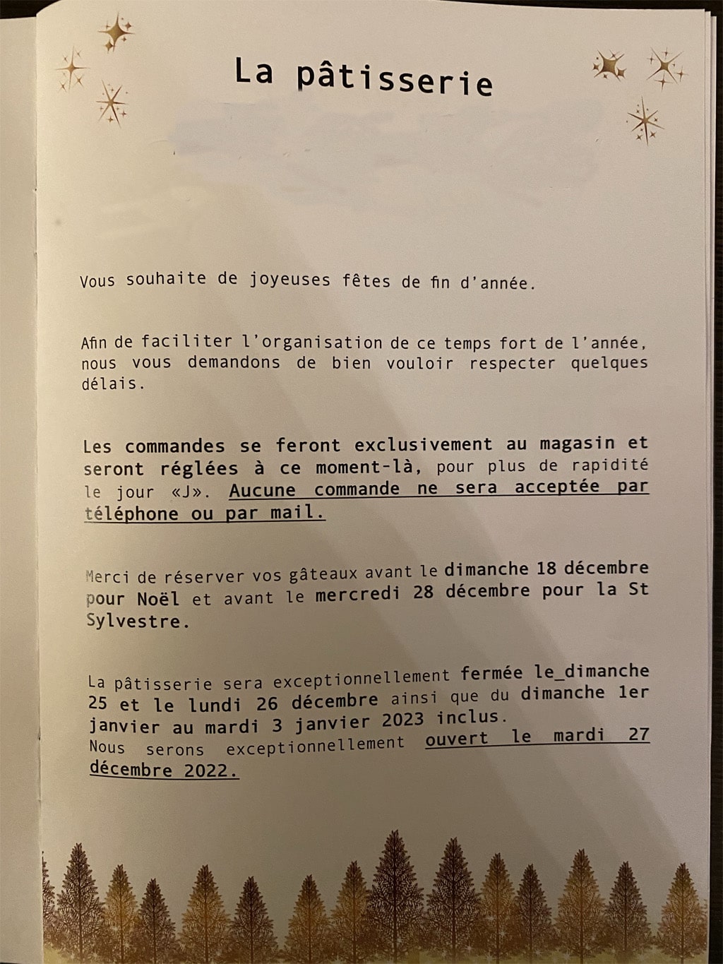 Gracias por reservar sus tartas antes del domingo 18 de diciembre para Navidad, y antes del miércoles 28 de diciembre para fin de año.”