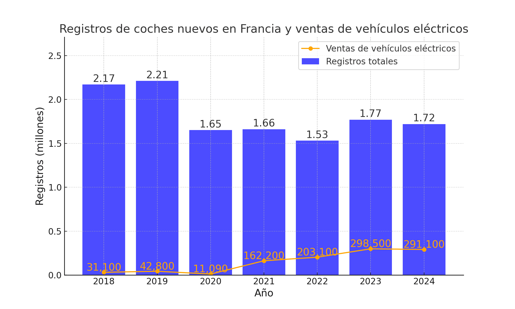 - Registrado de coches eléctricos en Europa en 2024: -5% en comparación con 2023
