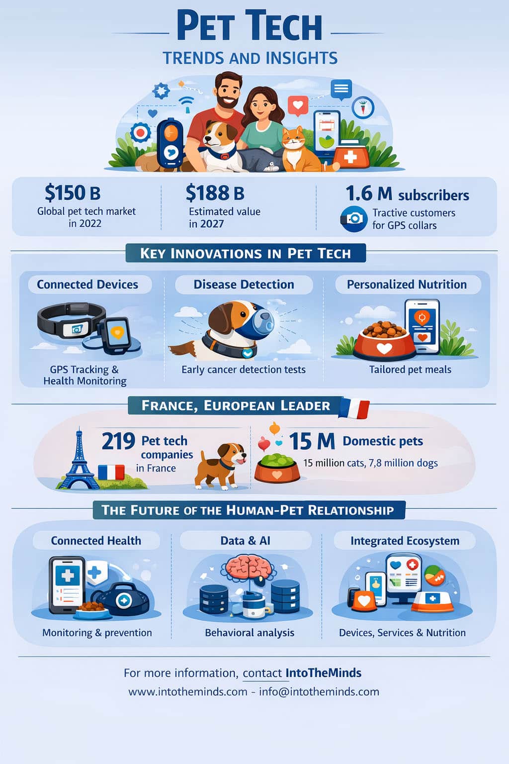 Las mascotas se han convertido en verdaderos miembros de la familia (un fenómeno conocido como antropomorfización — véase nuestro estudio del mercado del petfood), y esta evolución está transformando radicalmente un sector entero: el de la tecnología dedicada a los animales de compañía (“pet tech”). Hay opciones para todos: dispositivos conectados, aplicaciones de seguimiento de salud, servicios digitales personalizados. Nuestro equipo realiza estudios sobre estos mercados durante todo el año y hemos querido ofrecerte una visión general de las tendencias y perspectivas de la pet tech. ¡Buena lectura!
