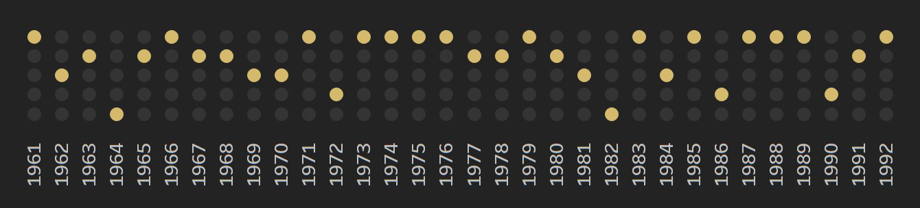 La visualización anterior (fuente) muestra algunos huecos entre las series temporales. Nuestro cerebro los rellena automáticamente al conectar los puntos de manera inconsciente, algo que también ocurre con las líneas de puntos, que tienden a verse como una línea completa.