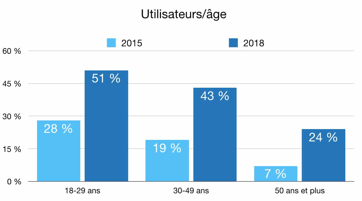 Le pourcentage d’utilisateurs a plus que doublé en quatre ans et seulement 3% ignorent l’existence de ces applications en 2018.