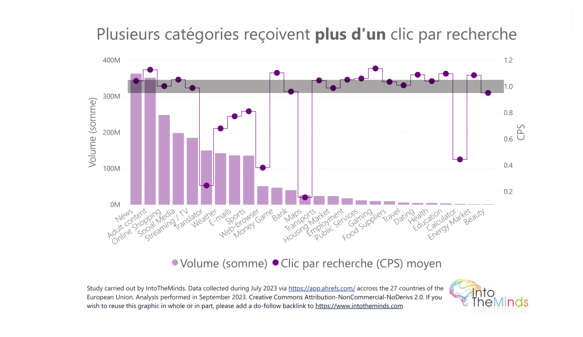 Le graphique montre les volumes de recherche des 26 catégories de sites sous forme d’histogramme. Les points correspondent à la valeur du CPS ou « Clic Per Search ». Cet indicateur correspond aux nombres moyens de clics que fait l’internaute par recherche. Si Google faisait parfaitement son travail, les résultats proposés sur la première page devraient vous permettre de trouver directement l’information que vous recherchez. Dans ce cas vous cliquerez directement sur le bon résultat de recherche et le CPS sera de 1. Au contraire, si vous devez vous y reprendre à plusieurs fois pour trouver ce que vous cherchez, le CPS sera supérieur à 1. Dans certains cas le CPS est inférieur à 1 (il peut même être proche de zéro). Cela signifie que l’internaute obtient sa réponse directement sur la page de recherche et n’a pas besoin de consulter un site. Ce comportement est typique des besoins de traduction, calcul, demande d’itinéraire. Les services de Google s’affichent directement dans la page de recherche, garantissant ainsi que vous ne vous échappiez pas de l’écosystème Google.