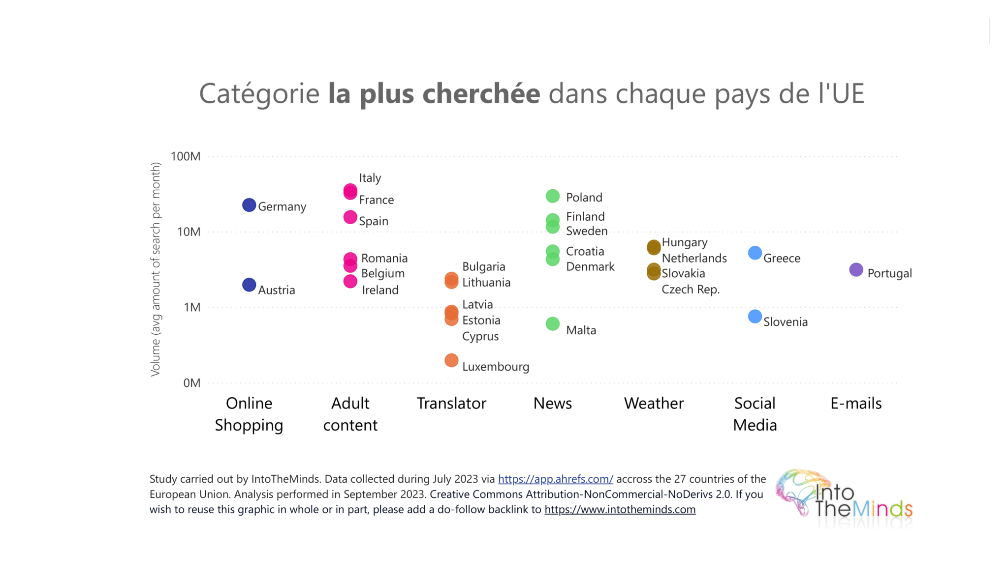 Nous avons utilisé Ahrefs pour obtenir les données concernant les mots-clés les plus recherchés dans l’Union Européenne. Nous avons obtenu des données les 50 mots-clés les plus recherchés dans chacun des 27 pays de l’Union Européenne, soit 1350 mots-clés sur une période de 12 mois allant de Juin 2022 à Juin 2023. Nous avons ensuite assigné chaque mot-clé à une catégorie indiquant le sujet de la recherche. Au total, 26 catégories ont pu être définies.