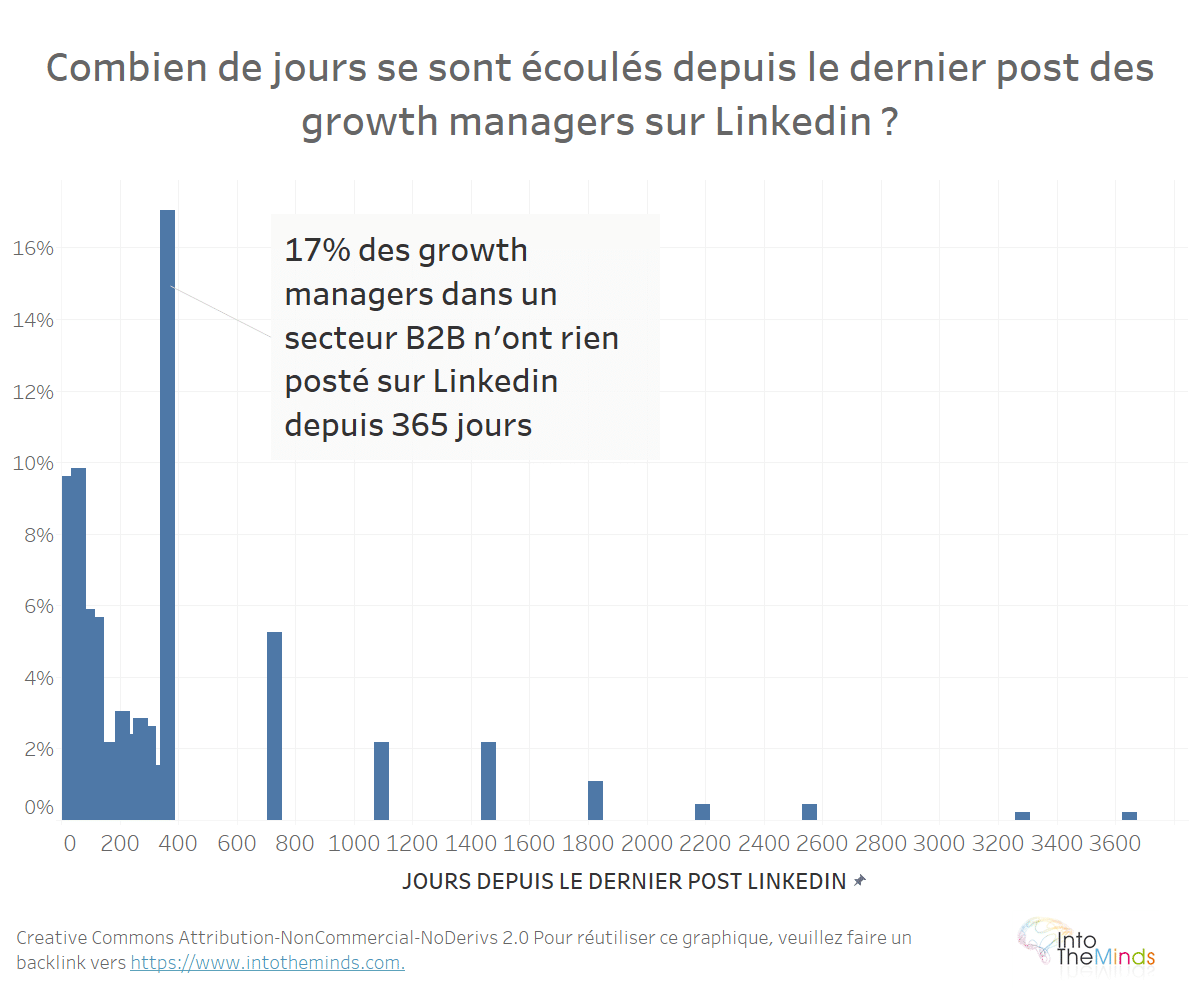 Dans la deuxième analyse nous avons étudié plus finement la date à laquelle les growth managers avaient publié sur Linkedin pour la dernière fois. Cette analyse permet d’affiner les résultats obtenus précédemment car nous ne limitons plus ici aux 3 derniers mois. Certains growth managers étaient d’ailleurs tellement peu actifs sur Linkedin qu’il nous a fallu remonter 10 ans en arrière pour trouver une trace de leur dernière activité.