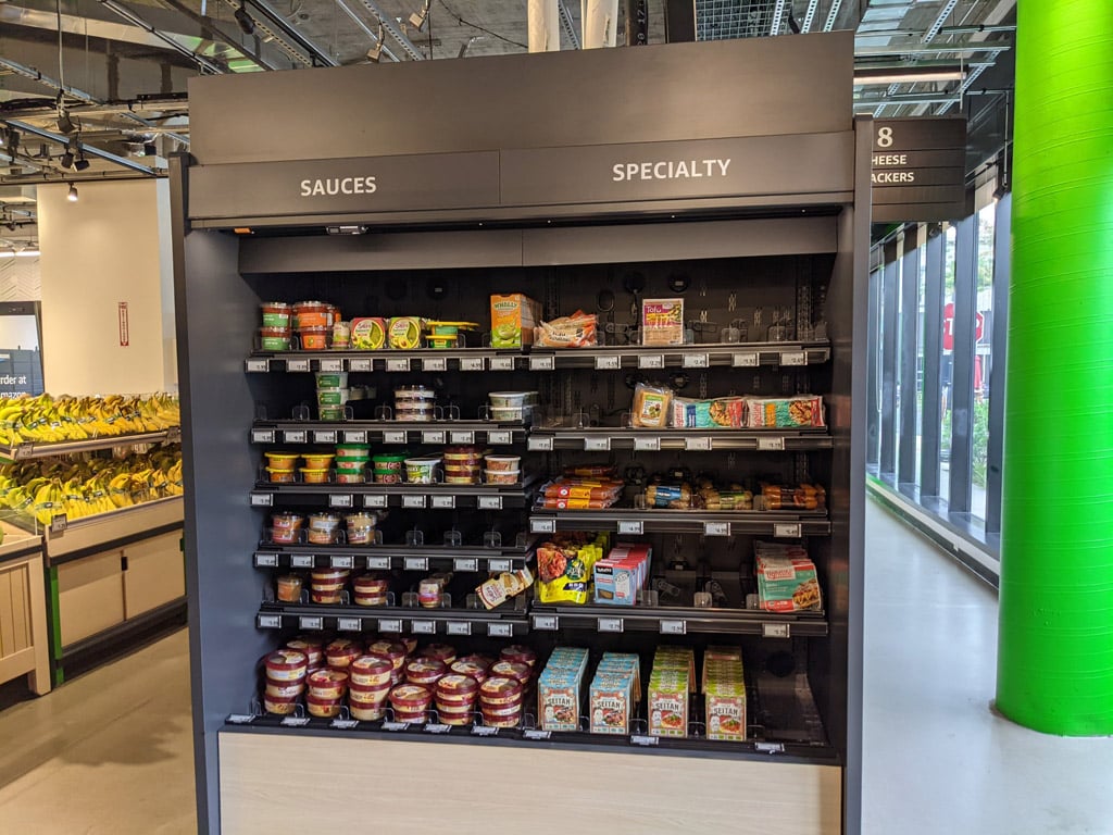 Uno degli effetti della tecnologia “Just Walk Out” è che tutti i prodotti devono essere in posizione ideale per essere riconosciuti. Di conseguenza, gli scaffali del negozio sono delineati, consentendo la segnaletica “just-in-time”. Visivamente, tutto è molto coerente, con cartelli sopra ogni reparto, integrati da schermi e pannelli informativi fissi.