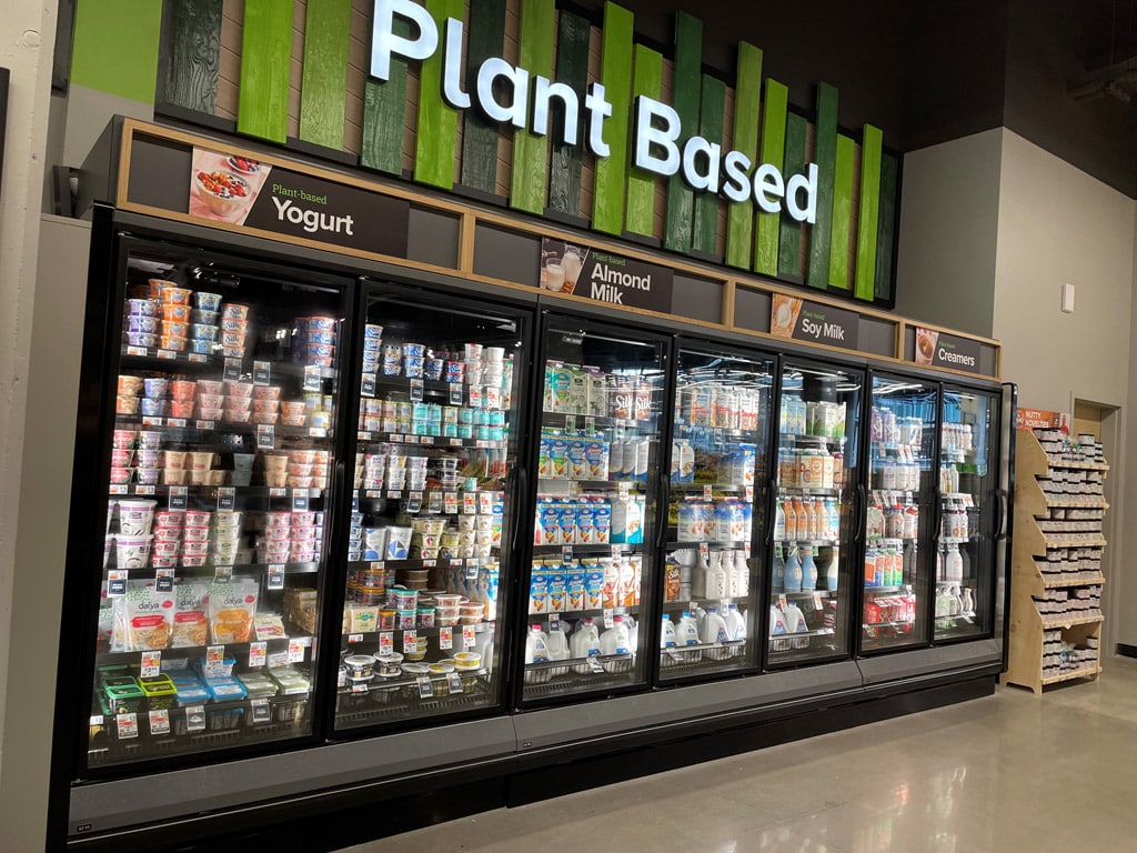 Infine, dobbiamo discutere dell’offerta vegana (“a base vegetale”). Quest’ultimo è particolarmente ricca. Contrariamente a un supermercato tradizionale dove questi prodotti sono sparsi tra quelli più convenzionali, qui gli è riservata una sezione. Questa scelta solleva interrogativi. Solleva domande sull’esperienza del cliente e sugli acquisti di opportunità. Il cliente viene in negozio appositamente per fare acquisti vegani o si lascia tentare da queste alternative mentre acquista prodotti convenzionali?
