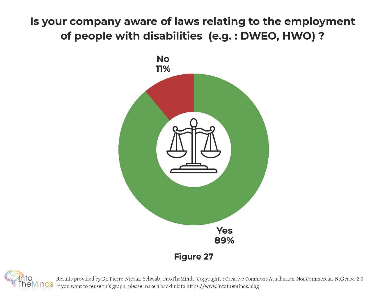 La stragrande maggioranza delle aziende europee non ha quindi obbligo legale di impiegare persone con disabilità. In questo contesto, ci sembra sorprendente che 89% dei manager HR nelle aziende che abbiamo interrogato dichiari di essere al corrente di queste leggi.