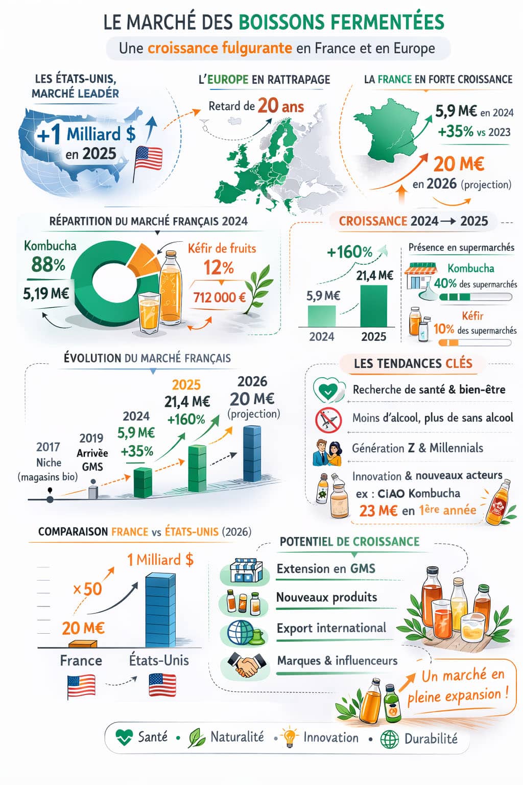 Nel 2024 il mercato francese delle bevande fermentate rappresenta 5,9 milioni di euro di fatturato, con una crescita del 35% rispetto al 2023. Nella grande distribuzione in particolare, questo valore raggiunge 21,4 milioni di euro nel 2025, ovvero una progressione del 160%.