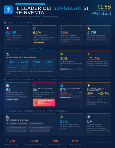 Il mercato francese dei surgelati sta attraversando un periodo di profonda trasformazione. Con un fatturato di 6,2 miliardi di euro in Francia alla fine di ottobre 2023, questo settore registra evoluzioni contrastanti che ridefiniscono le regole del gioco. In questo contesto dinamico, Picard si impone come un caso di studio particolarmente illuminante per comprendere le nuove dinamiche del marketing alimentare. Il nostro studio di consulenza marketing offre in questo articolo un’analisi approfondita. L’insegna specializzata nei prodotti surgelati ha sviluppato un approccio marketing singolare che trascende i codici tradizionali del suo settore. Con un fatturato previsto di 1,8 miliardi di euro per l’esercizio 2025-2026 e una crescita del 7% in due anni, Picard dimostra come una strategia marketing ben orchestrata possa trasformare la percezione di un’intera categoria di prodotti. Contatta lo studio IntoTheMinds