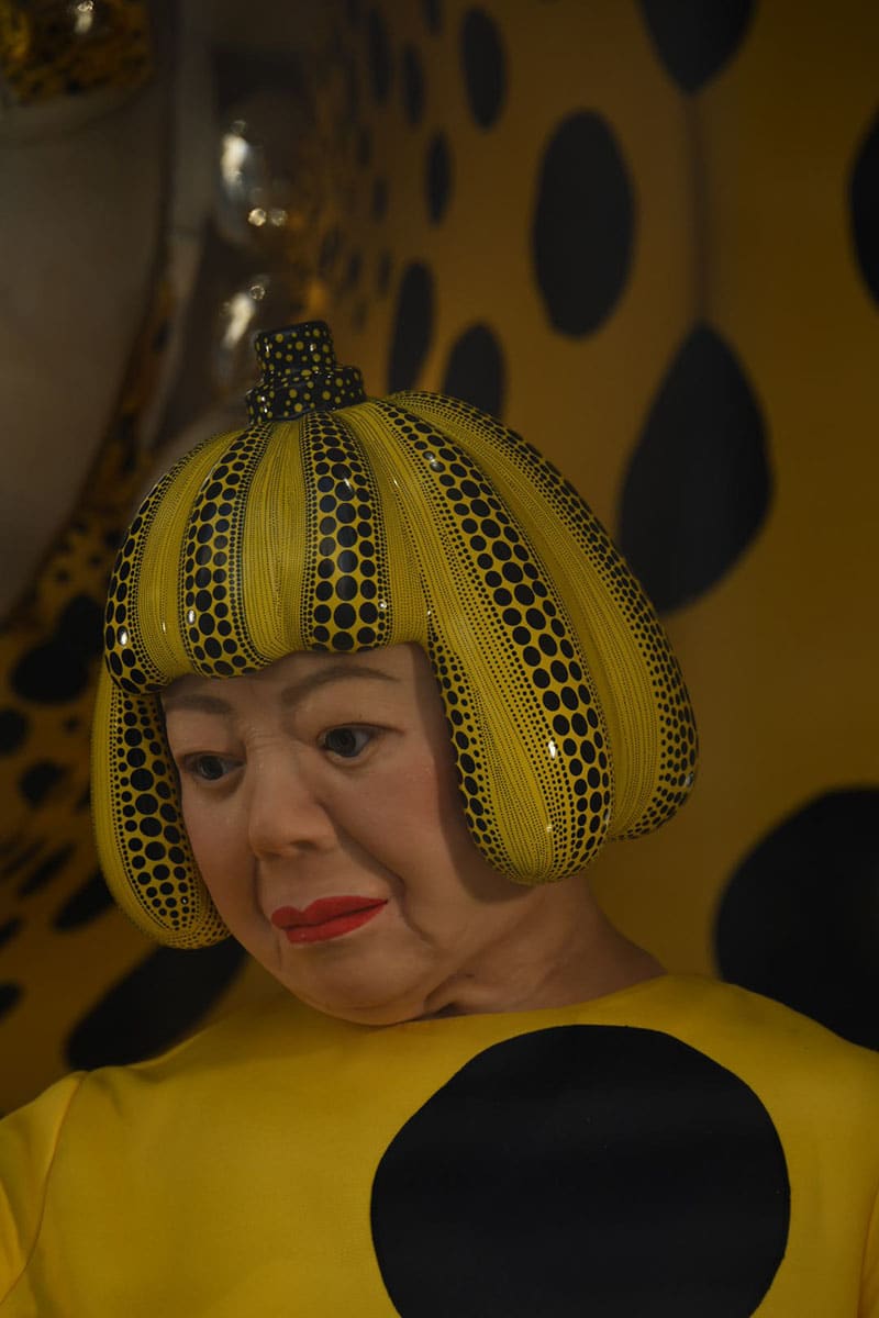 Il pezzo forte della mostra è la vetrina all’angolo tra Rue Saint-Honoré e Place Vendôme. Qui “vive” un robot umanoide che ha assunto le sembianze di Yayoi Kusama. Il robot dipinge, le sue palpebre si muovono come quelle di un essere umano e i suoi occhi vi guardano. Tutto è più grande della vita.