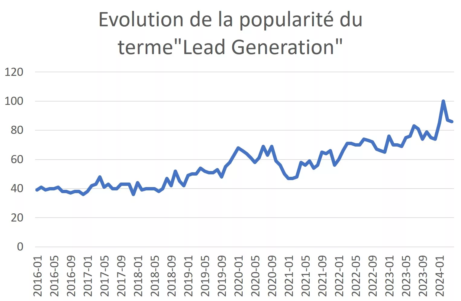Force est d’abord de constater que la popularité du terme « lead generation » est relativement récente. Selon Google Trends, ce n’est que début 2021 que la popularité de ce terme a commencé à augmenter. Sur base du graphique ci-dessous, on peut, grosso modo, dire que les recherches sur « lead generation » sont 2 fois plus nombreuses en 2024 qu’avant 2019. En 5 ans, l’intérêt pour la « lead generation » a donc doublé.