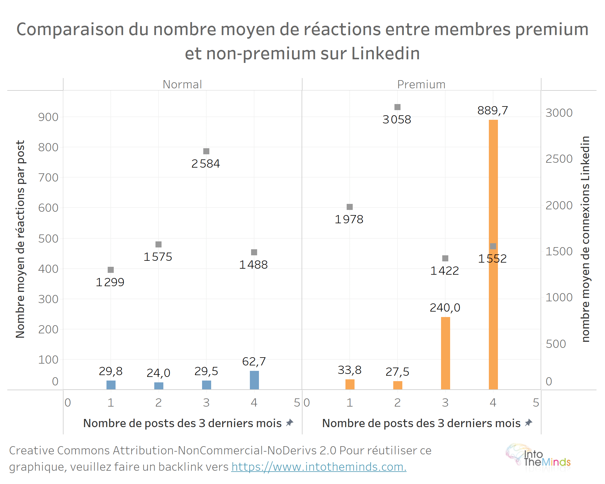 Sur le graphique ci-dessus, j’ai comparé des utilisateurs premium et non-premium dont l’activité était similaire. Sur la période d’observation (3 mois) ils avaient publié le même nombre de posts (1, 2, 3 ou 4). J’ai également indiqué par un carré gris le nombre moyen de connexions des comptes en question car bien entendu le « reach » d’un post dépend aussi de l’étendue du réseau. C’était d’ailleurs le facteur le plus important dans mon étude sur la viralité.
