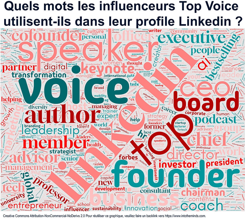 Nuage de mots représentant les termes utilisés par les influenceurs Linkedin Top Voice dans leurs descriptions de profil. Copyrights : IntoTheMinds