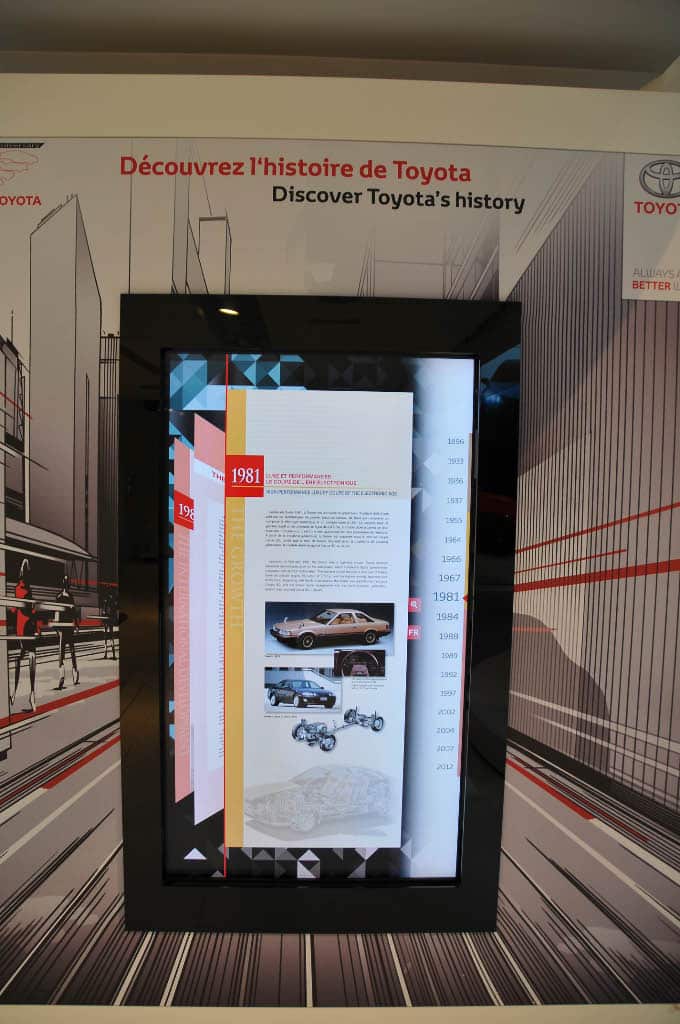 Chez Toyota encore des dispositifs plus classiques d’écrans tactiles verticaux étaient disponibles qui permettaient, comme dans un grand livre, de feuilleter l’histoire de la marque.