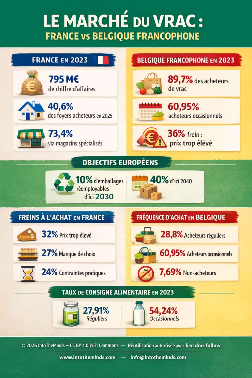 Le commerce en vrac n’est plus cantonné aux magasins bio spécialisés. Entre les nouvelles réglementations de l’UE et les attentes des consommateurs qui s’adaptent à la conjoncture, le marché du vrac suit des dynamiques différentes selon les pays. Mon analyse se concentre sur deux pays qui correspondent aux 2 territoires de prédilection de mon cabinet d’études de marché : la France, où le secteur peine à retrouver son élan d’avant-crise, et la Belgique francophone, qui affiche une adoption plus large mais essentiellement occasionnelle.
