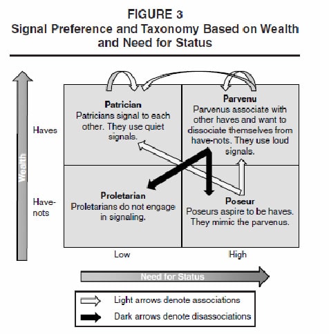 Les patriciens s’opposent aux « parvenus », qui veulent faire étalage de leur argent, et aux « poseurs » qui n’ont pas les moyens de leurs ambitions et se rabattent sur des faux (voir figure ci-dessous).