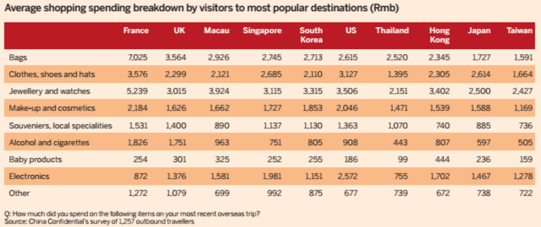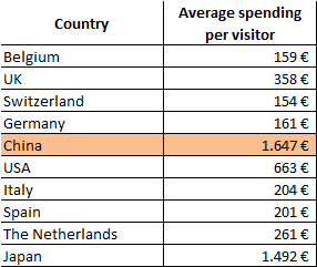 Dit cijfer is echter niet in overeenstemming met een studie van de Banque de France, waarin sprake is van een gemiddelde uitgave per Chinese bezoeker in 2017 van ongeveer € 1.647, iets meer dan Japanse toeristen (€1.492). Desondanks en ter vergelijking, dit is twee keer zoveel als Amerikaanse toeristen, en 10x meer dan Duitse toeristen. De bijdrage van Chinese toeristen is daarom zeer belangrijk voor de Franse detailhandel.