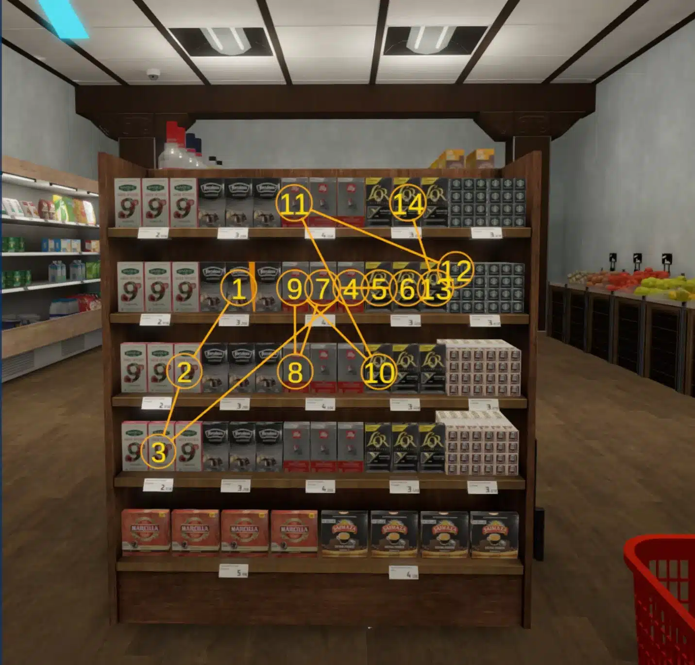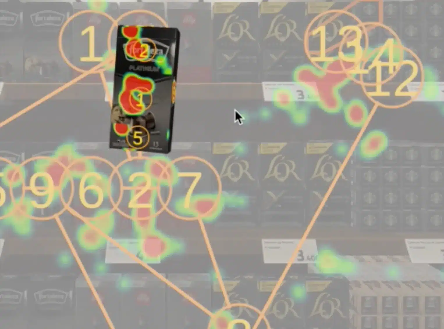 - Aandachtsanalyse: eye-tracking kan worden gebruikt om te analyseren welke merken het eerst de aandacht trokken, en om de volgorde te volgen (oogbeweging van het ene product naar het andere, zoals in de bovenstaande afbeelding).