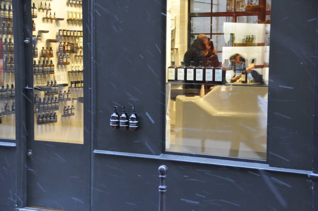 Zoals u kunt zien op foto’s van die dag (met sneeuw overigens), had Aesop drie flacons op de muur van zijn winkel geplaatst om voorbijgangers producten te laten testen. Deze oplossing is niet nieuw (sommige parfumerieën hebben het al geprobeerd) maar producten van Aesop lenen zich er beter toe dan parfum. Voor ons is de straat het decor geworden van interessante observaties van consumentengedrag buiten de winkel.