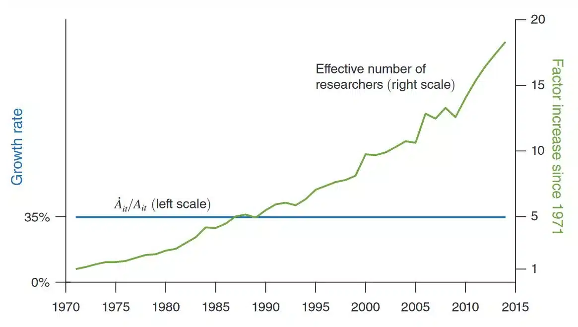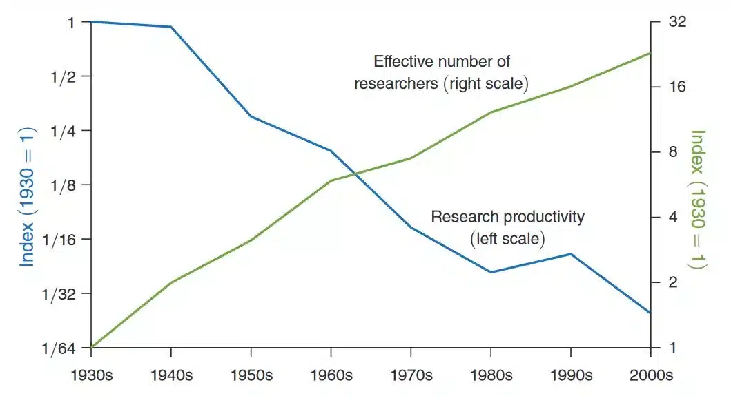 Deze onderzoekers tonen aan dat, ongeacht het vakgebied, de productiviteit minder snel toeneemt dan de R&D-inspanning. Met andere woorden, het aantal onderzoekers dat nodig is om de productiviteit te verhogen is niet constant. Het neemt alleen maar toe, waardoor het rendement van R&D mechanisch daalt. Dit wordt geïllustreerd door de onderstaande grafiek uit het artikel in kwestie. Terwijl het aantal onderzoekers sinds de jaren 1930 alleen maar is toegenomen, is de onderzoeksproductiviteit alleen maar gedaald.
