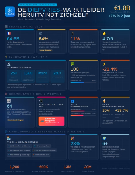 Picard positioneert zich als een gewilde specialist in plaats van een discounter. Het merk zet in op innovatie met 250 nieuwe producten per jaar, een premium klantervaring (4,7/5 op Google) en een omnichannel-strategie. In tegenstelling tot supermarkten die diepvries als aanvulling aanbieden, maakt Picard deze specialisatie tot kernactiviteit en onderscheidende kracht.