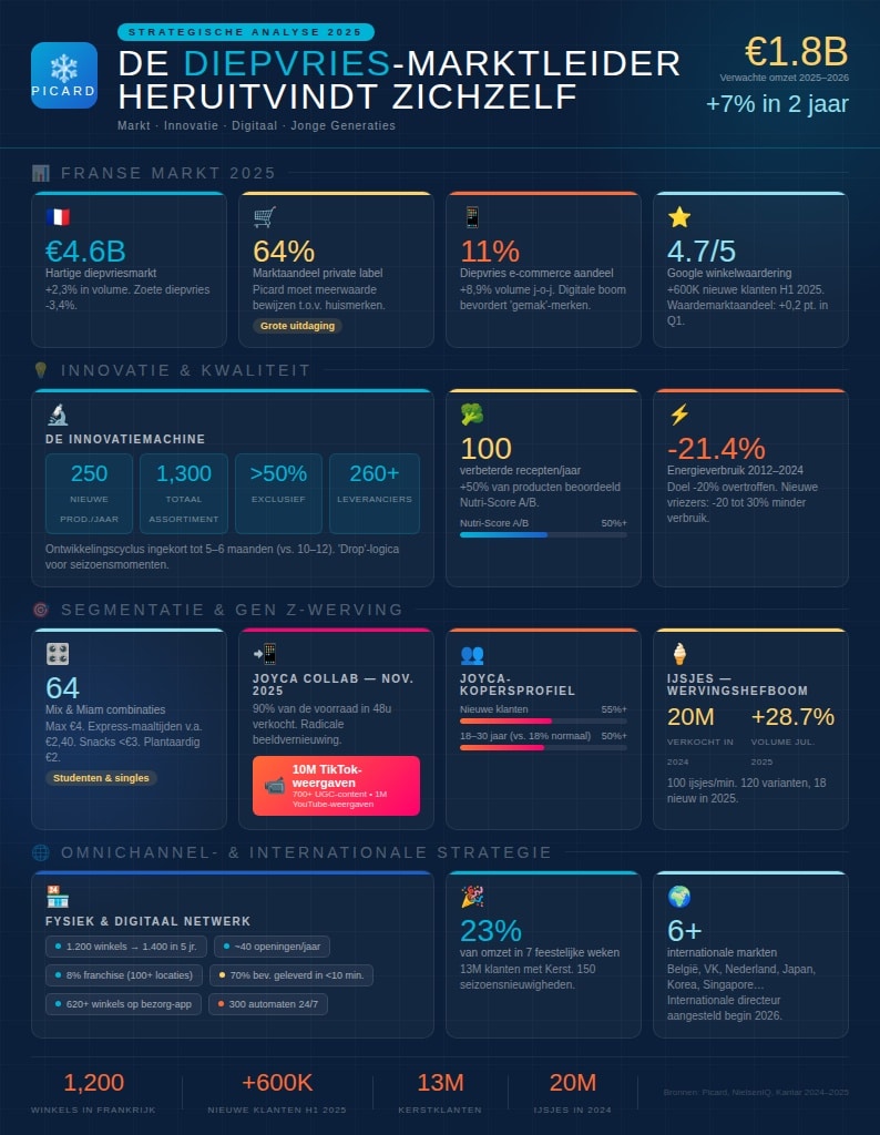 Picard positioneert zich als een gewilde specialist in plaats van een discounter. Het merk zet in op innovatie met 250 nieuwe producten per jaar, een premium klantervaring (4,7/5 op Google) en een omnichannel-strategie. In tegenstelling tot supermarkten die diepvries als aanvulling aanbieden, maakt Picard deze specialisatie tot kernactiviteit en onderscheidende kracht.