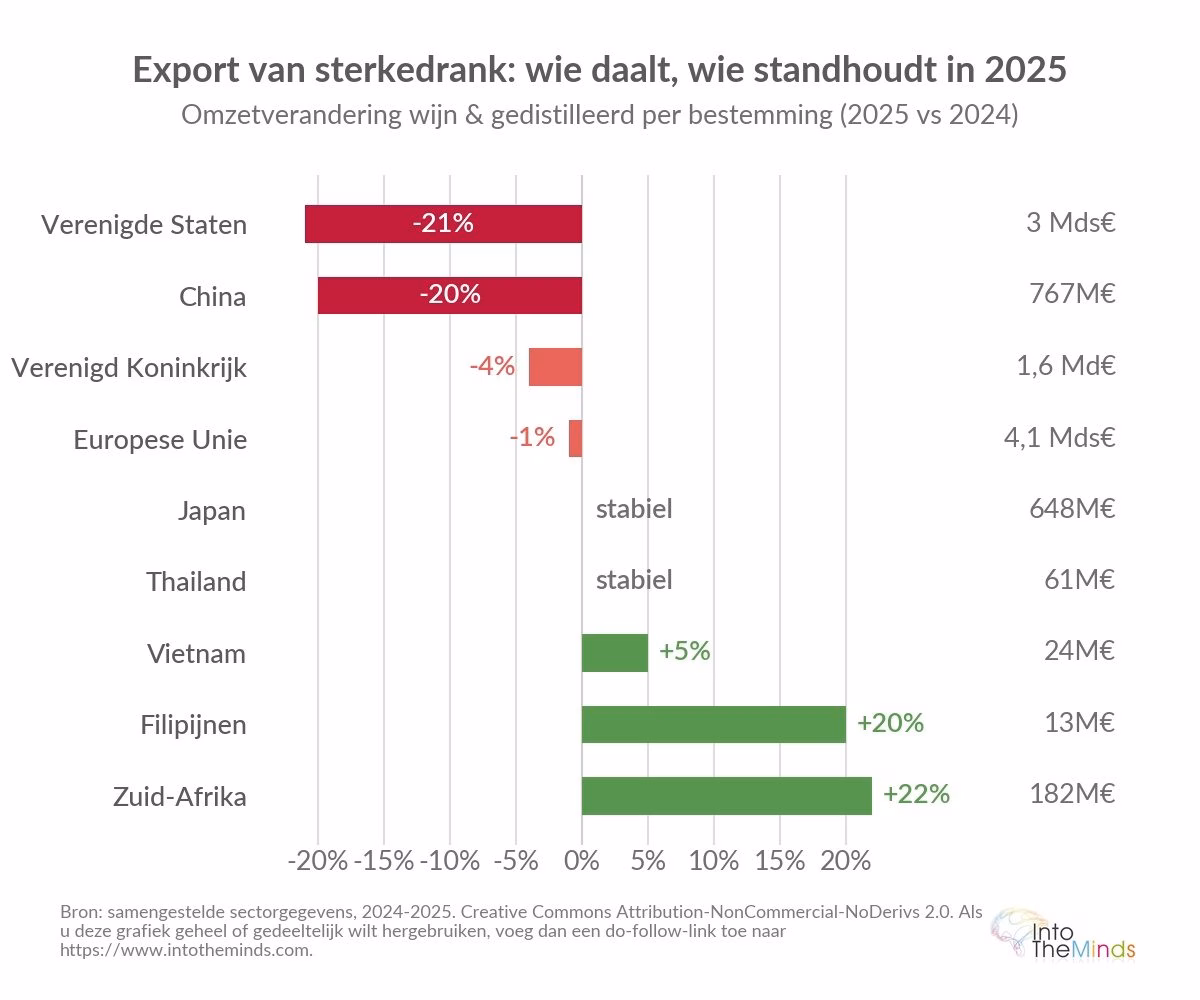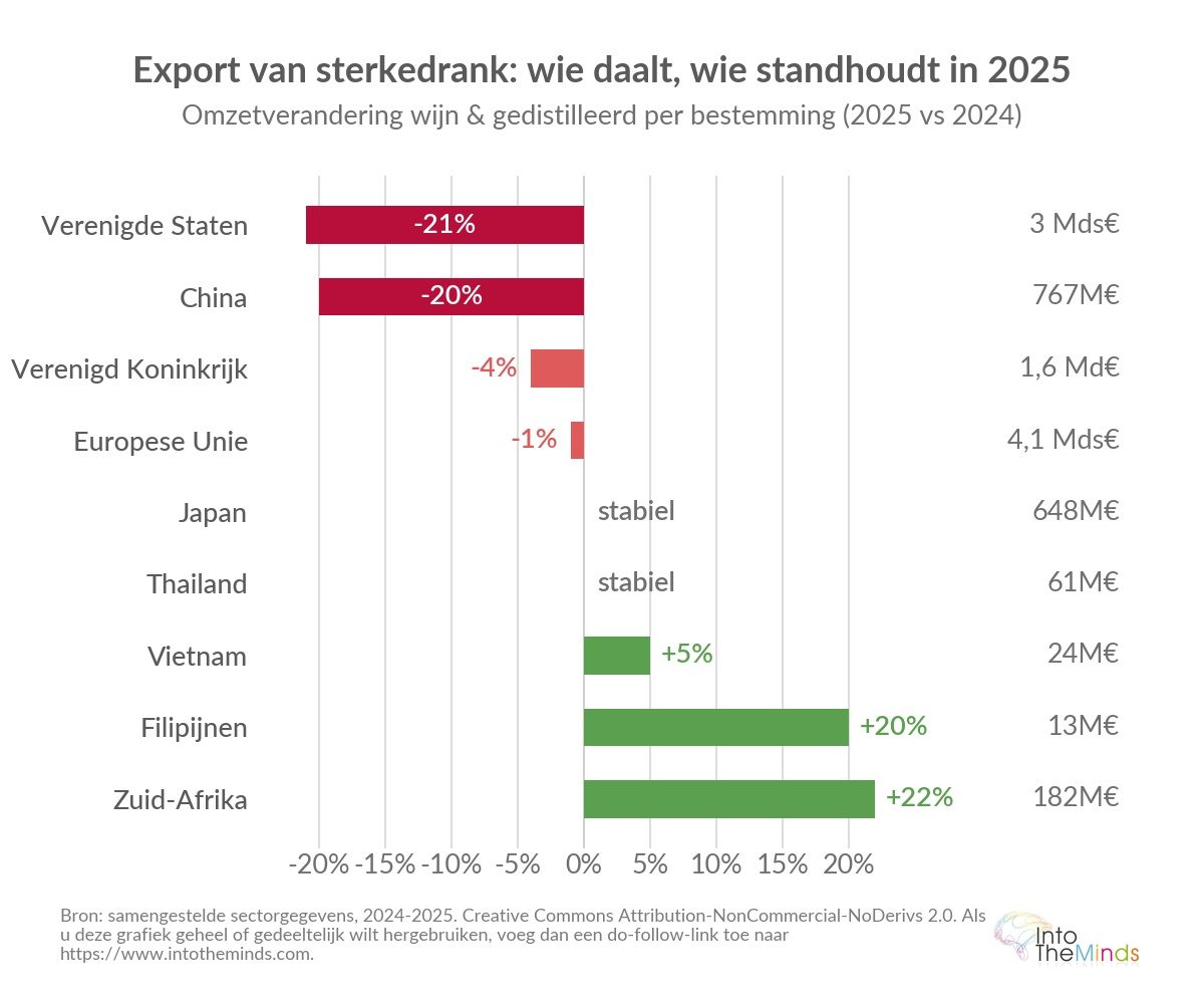 De internationale handel in sterke dranken is bijzonder gevoelig voor de huidige geopolitieke spanningen. De Franse sector van wijnen en sterke dranken realiseerde in 2025 een exportomzet van 14,3 miljard euro, een daling van 8% op jaarbasis. Alleen de sterke dranken daalden met 17% tot 3,7 miljard euro.
