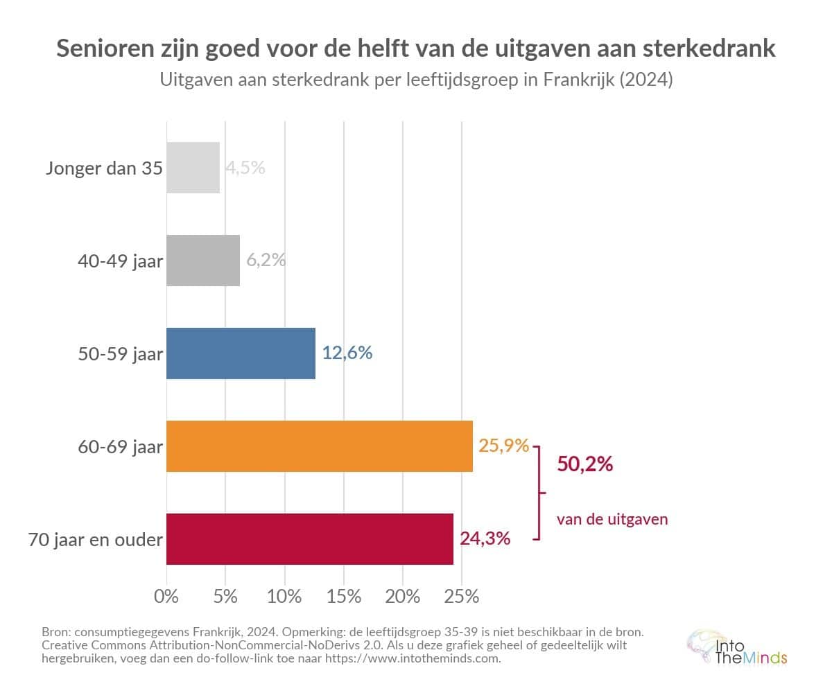 Deze transformatie gaat gepaard met een vergrijzing van de klantenbasis. De uitgaven aan sterke dranken zijn sterk geconcentreerd bij senioren: zestigers vertegenwoordigen 25,9% van de uitgaven en 70-plussers 24,3%, tegenover slechts 4,5% voor de groep onder 35 jaar in 2024.