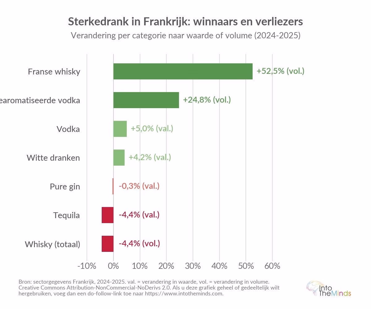 In Frankrijk doordringt deze dynamiek inmiddels alle categorieën. In cafés, hotels en restaurants zag de Spritz zijn marktaandeel in waarde met 32% stijgen in 2024. Gearomatiseerde vodka’s bereikten in 2025 1,8 miljoen liter, een stijging van 24,8%. Deze “cocktailisering” maakt het mogelijk de klantenbasis te verbreden buiten de traditionele gebruiksmomenten.