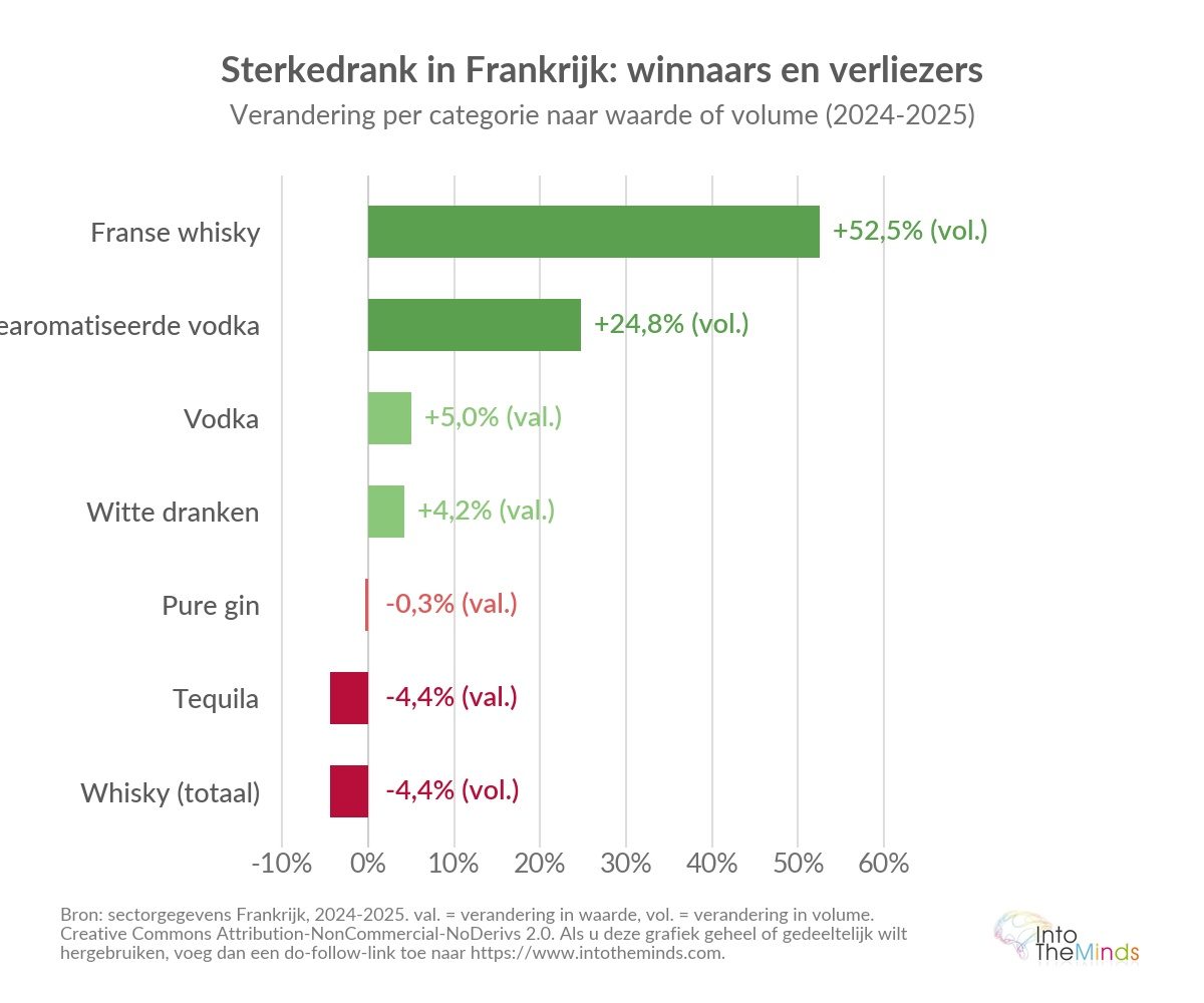 Analyse van de Franse markt toont uiteenlopende dynamieken afhankelijk van de categorie sterke dranken. Whisky blijft dominant met 2,3 miljard euro omzet in 2022, maar zijn leiderschap brokkelt af. In 2025 daalde de whiskymarkt in de detailhandel opnieuw tot 91,5 miljoen liter (-4,4%).