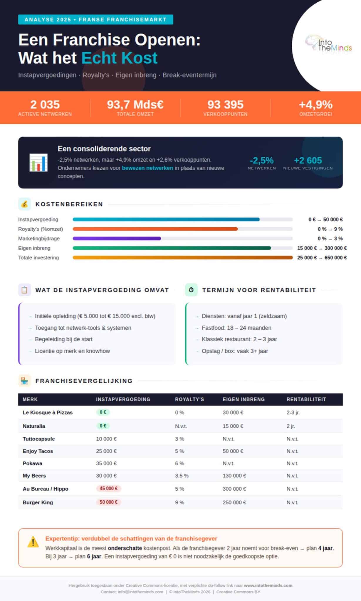 Wat zijn de kosten van een franchise? In dit artikel vindt u een analyse van alle kosten die verbonden zijn aan het starten van een franchise en een vergelijking van 21 merken.