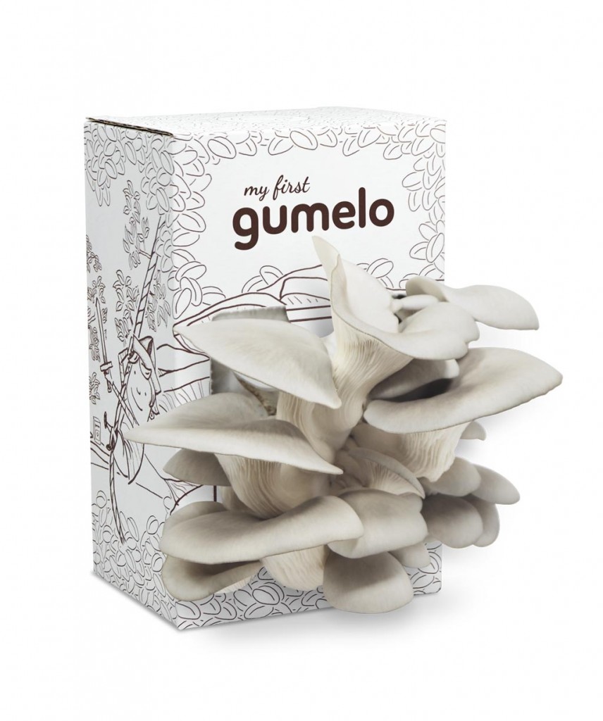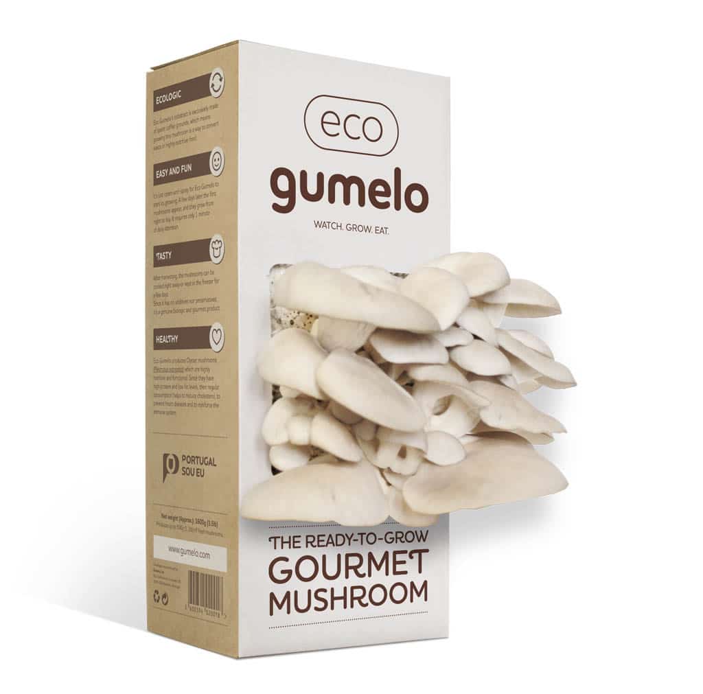 Almeirim is bekend voor zijn restaurants. Het team van Gumelo vindt de koffiedrab die ze nodig heeft bij de verschillende etablissementen. Vervolgens wordt er min of meer op artisanale wijze ingezaaid. De koffiedrab en myceliums worden dan hermetisch afgesloten in een zak, die in een doos wordt gestoken. Tiago deed een uitstekende job door een aantrekkelijke verpakking te ontwerpen in gerecycleerd karton en door enkel inkt op basis van water te gebruiken, geheel in lijn met het marketingconcept. Alles wat u nodig heeft, is de doos. U opent ze, steekt met een mes door de zak, verstuift er tweemaal per dag water overheen en spoedig zult u lekkere oesterzwammen kunnen oogsten.