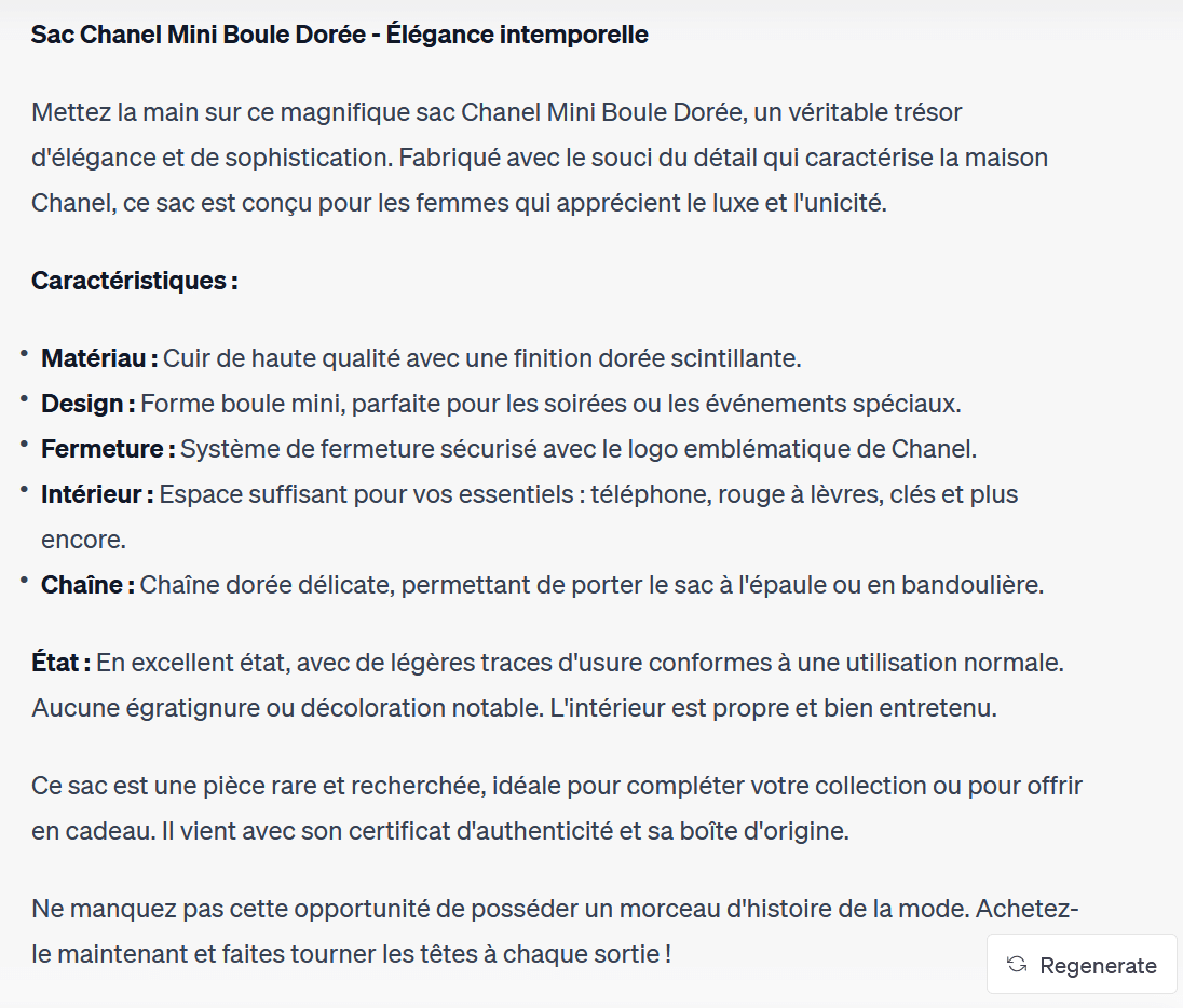 Toch kan het gemakkelijk veel beter worden gedaan. ChatGPT zou een veel rijker resultaat hebben opgeleverd. Hier ziet u bijvoorbeeld hoe een simplistische vraag als “Kunt u een beschrijving maken van de Chanel mini gold ball bag die te koop is op een tweedehandssite?