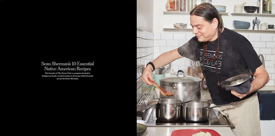 Als voorbeeld koos ik dit artikel (Engelse site) over de keuken van de Sioux-indianen. The New York Times publiceert ook artikelen met een veel klassieker ontwerp, maar dit vind ik bijzonder mooi. Vooreerst een grote afbeelding met een korte tekst (links) die uitnodigt om verder te gaan (zie screenshot hierboven). Verderop in het artikel is er een opeenvolging van beelden en korte teksten rondom een lijst (zie hiernaast) om de verschillende traditionele recepten voor te stellen.