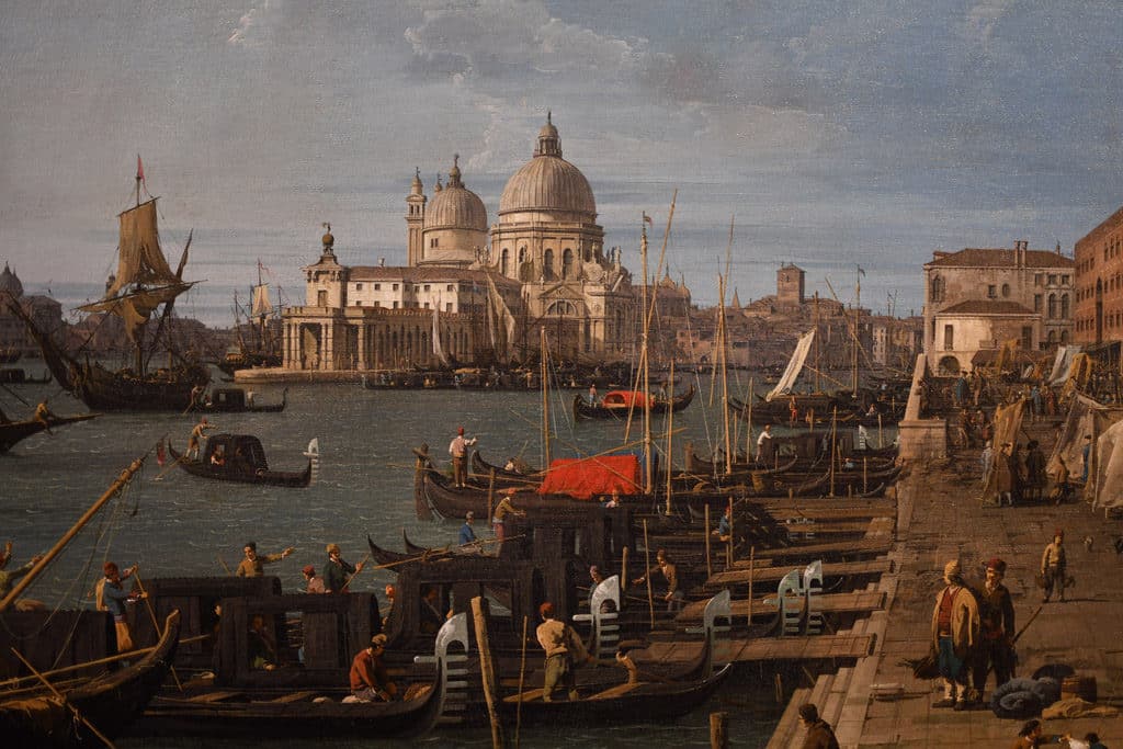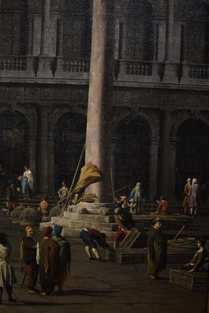 Canaletto legt vervolgens het leven tot in de kleinste details vast: zijn schilderijen bieden verschillende interpretatieniveaus: van het meest algemene (de globale scène) tot het meest bijzondere (de verschillende scènes van het leven binnen de compositie) vind ik het bijzonder interessant om me in zijn schilderij te verdiepen en al die kleine scènes te ontdekken terwijl je het schilderij leest, om nieuwe details op te merken telkens je oog loskomt van de globale betekenis en op zoek gaat naar details die op het eerste gezicht onzichtbaar blijven.
