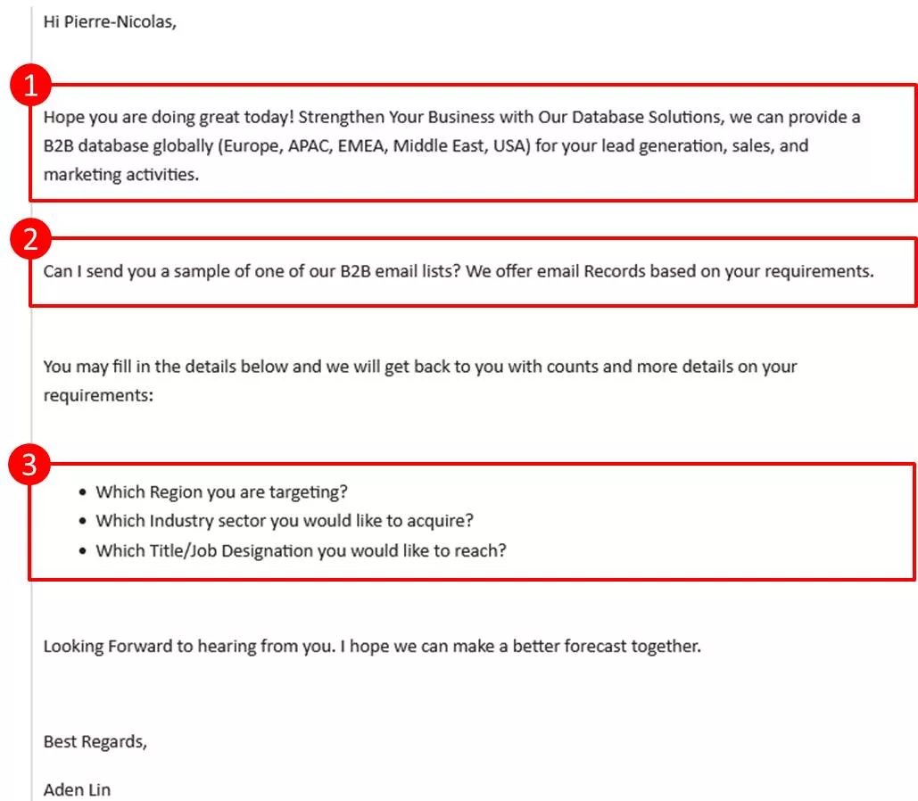 Het begon allemaal met een geautomatiseerde e-mail zoals we er allemaal wel ontvangen en die normaliter altijd in de spambox belanden. Maar deze keer belandde de mail in mijn inbox op een moment dat ik 5 minuten over had. En ik maakte de fout om een monster te vragen. Deze initiële fout veranderde geleidelijk in de hoop om tegen een lage prijs alle besluitvormers te bereiken die waarschijnlijk geïnteresseerd zouden zijn in onze diensten. Maar dat liep niet helemaal volgens plan.